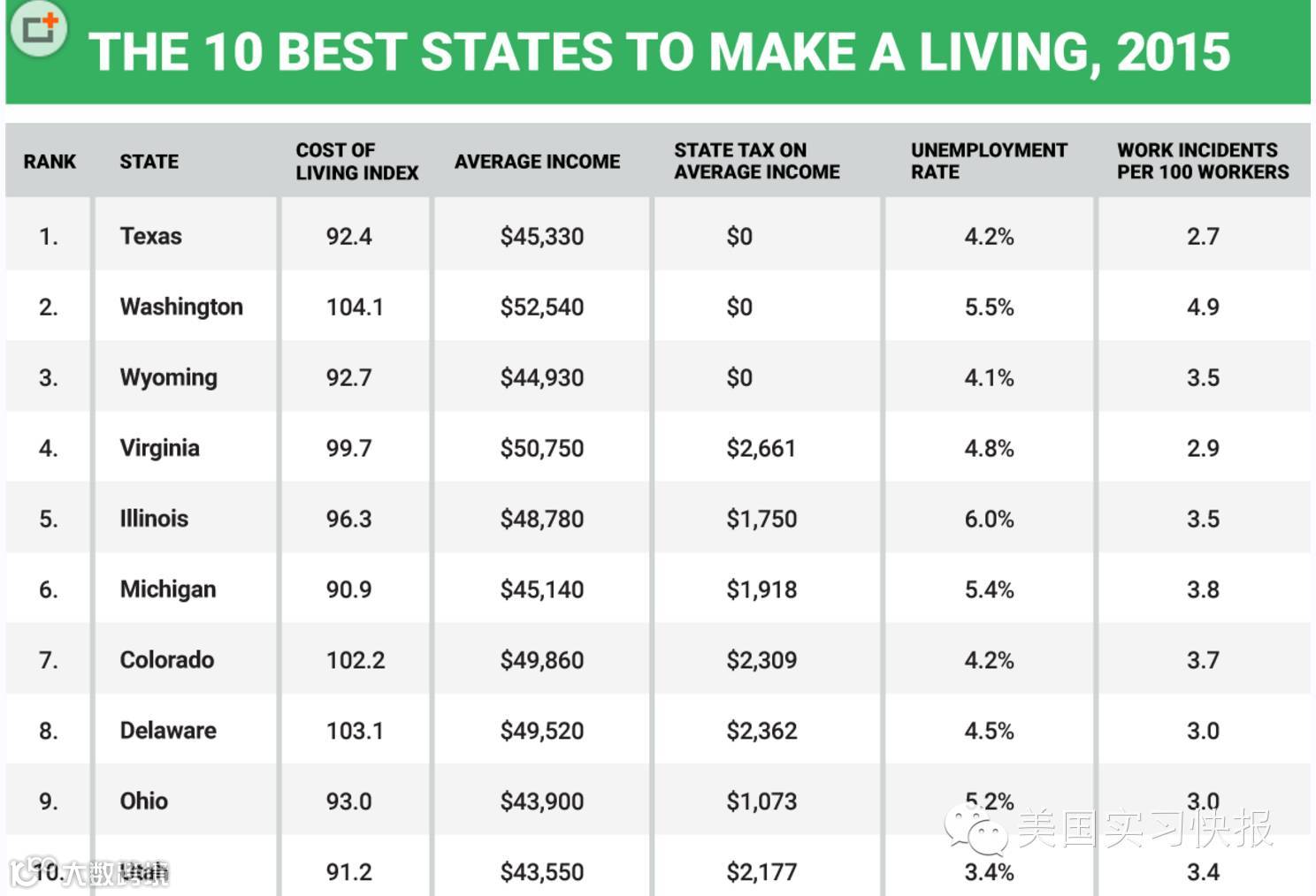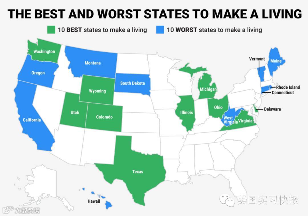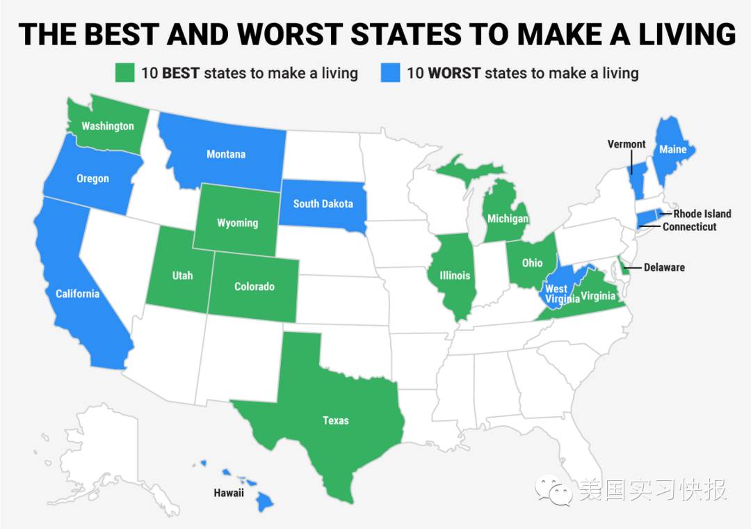 该排名主要根据以下因素作为评选参考:平均工资、州税、生活成本、失业率与工伤事故。