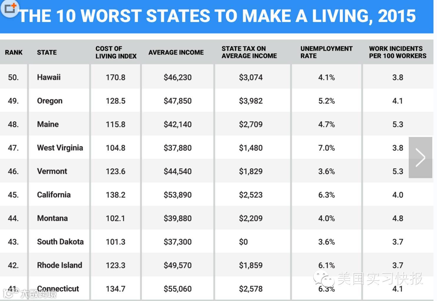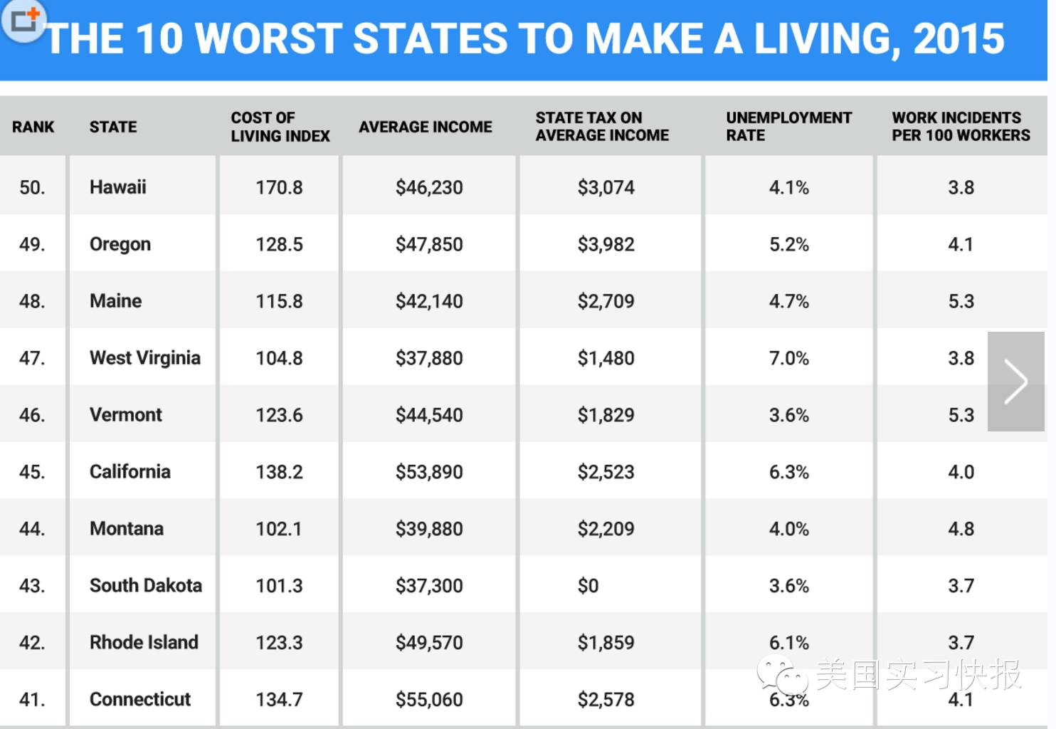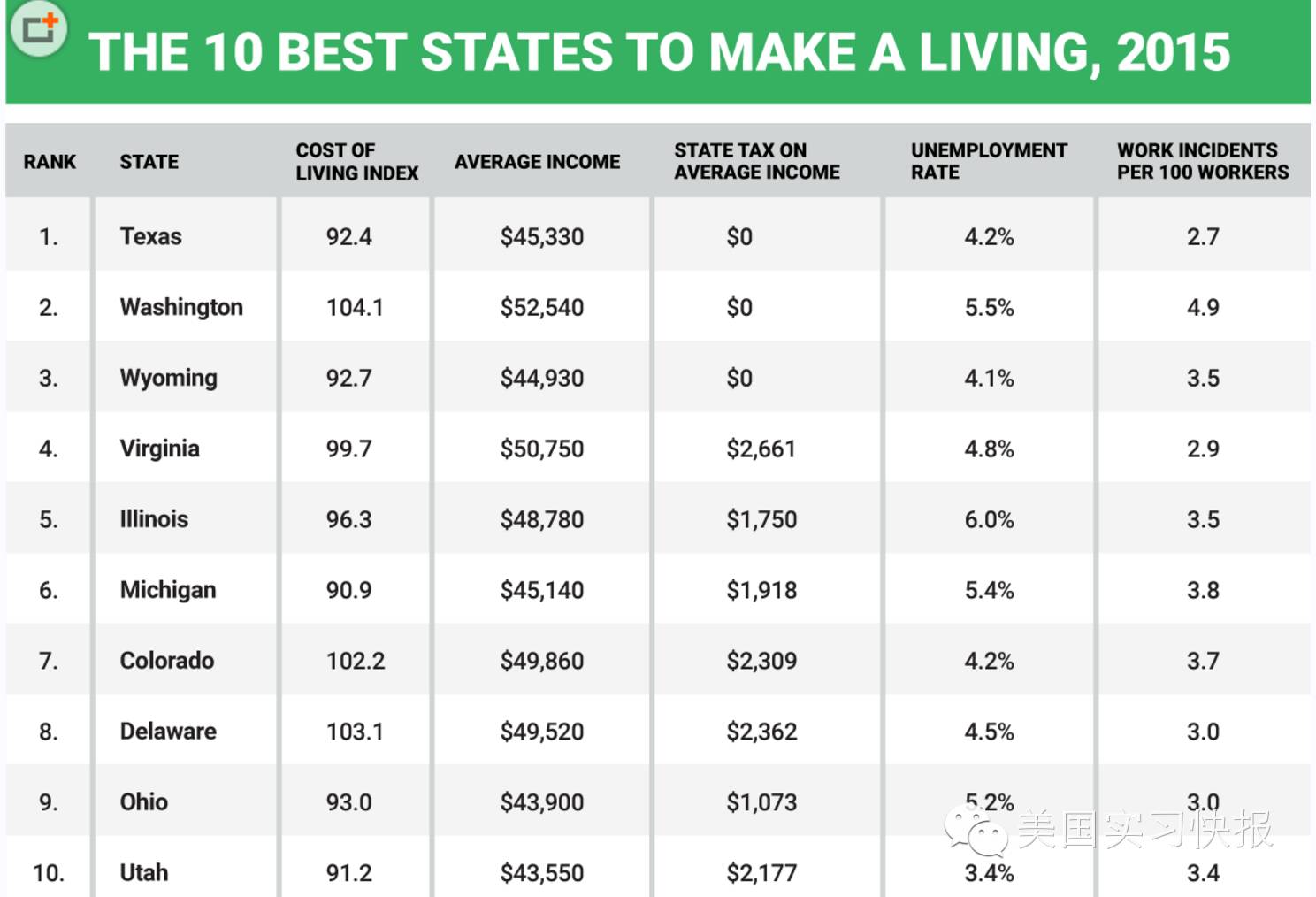 该排名主要根据以下因素作为评选参考:平均工资、州税、生活成本、失业率与工伤事故。