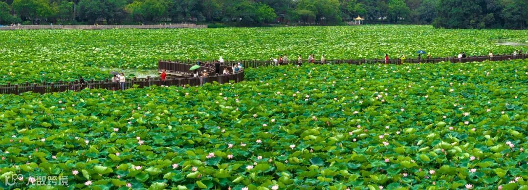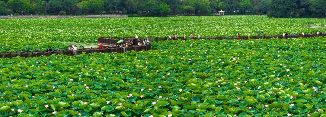 前来赏花的游客沿着莲湖的栈道