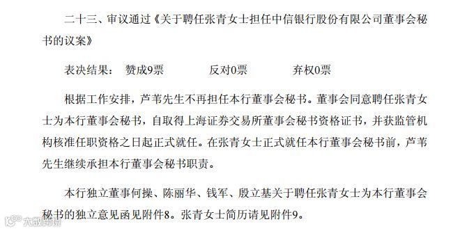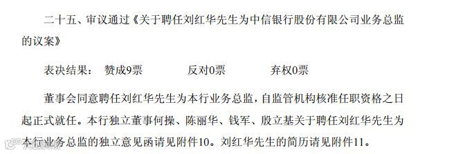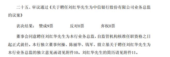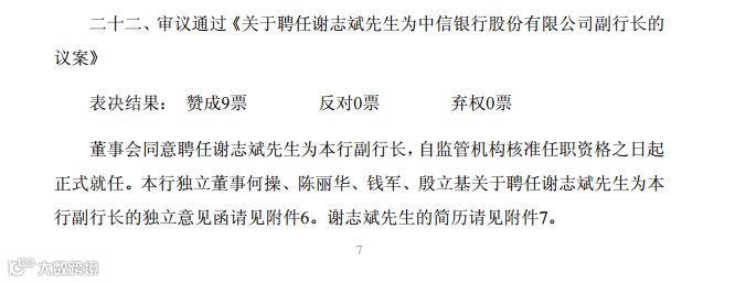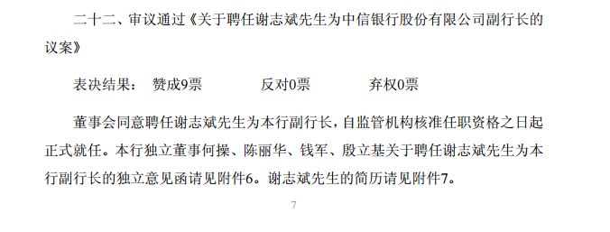 中信银行审议通过关于聘任谢志斌担任副行长等的议案