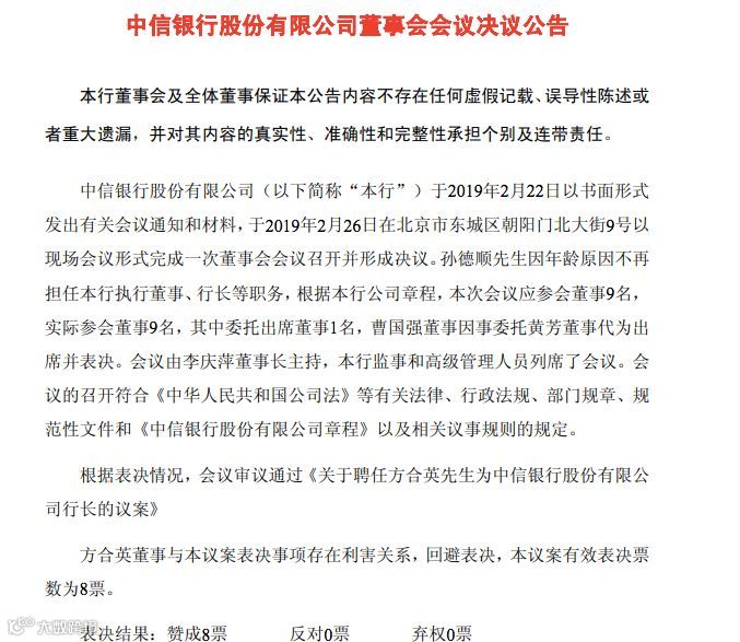 日前,中信银行进行了换帅,行长孙德顺因年龄原因离任,董事会同意聘任方合英为行长。