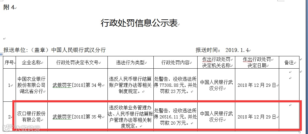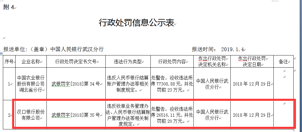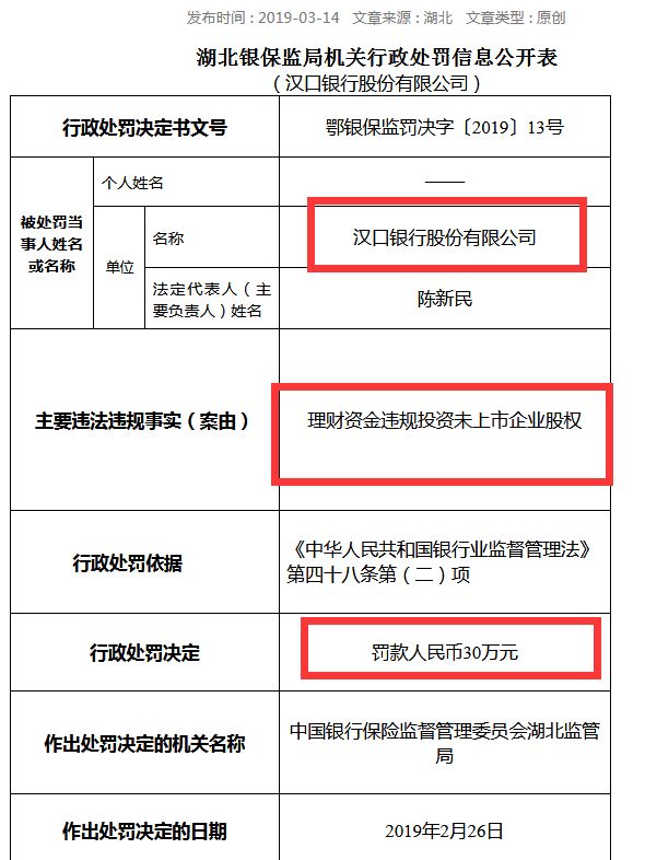 3月14日,湖北银保监局公布的鄂银保监罚决字〔2019〕13号处罚显示,汉口银行股份有限公司存在理财资金违规投资未上市企业股权的行为。
