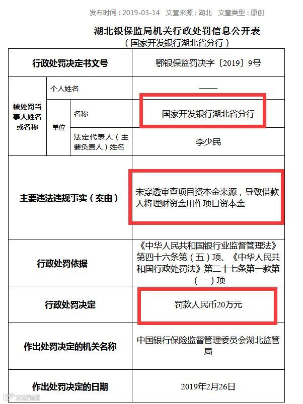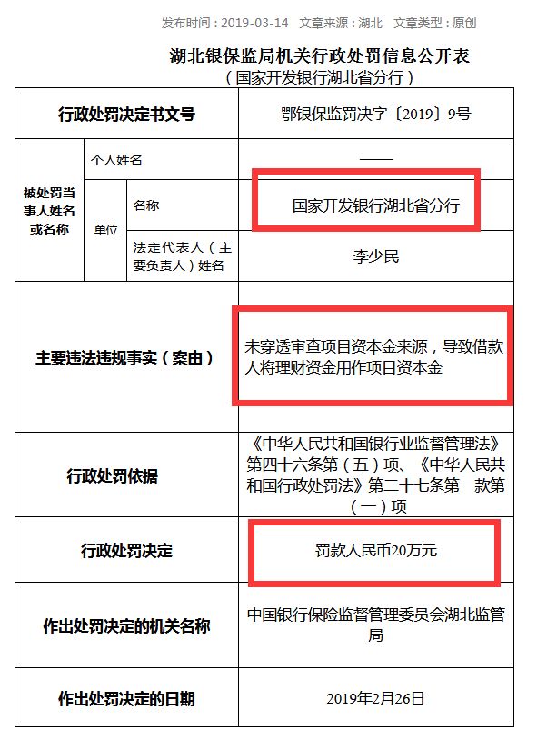 其二,国家开发银行湖北省分行存在未穿透审查项目资本金来源,导致借款人将理财资金用作项目资本金行为。根据《中华人民共和国银行业监督管理法》第四十六条第(五)项、《中华人民共和国行政处罚法》第二十七条第一款第(一)项规定,中国银行保险监督管理委员会湖北监管局对其处以罚款人民币20万元。