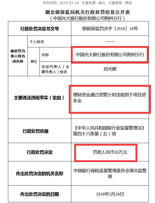 其一,中国光大银行股份有限公司荆州分行存在理财资金通过资管计划违规用于项目资本金行为。根据《中华人民共和国银行业监督管理法》第四十六条第(五)项规定,中国银行保险监督管理委员会湖北监管局对其处以罚款人民币30万元。