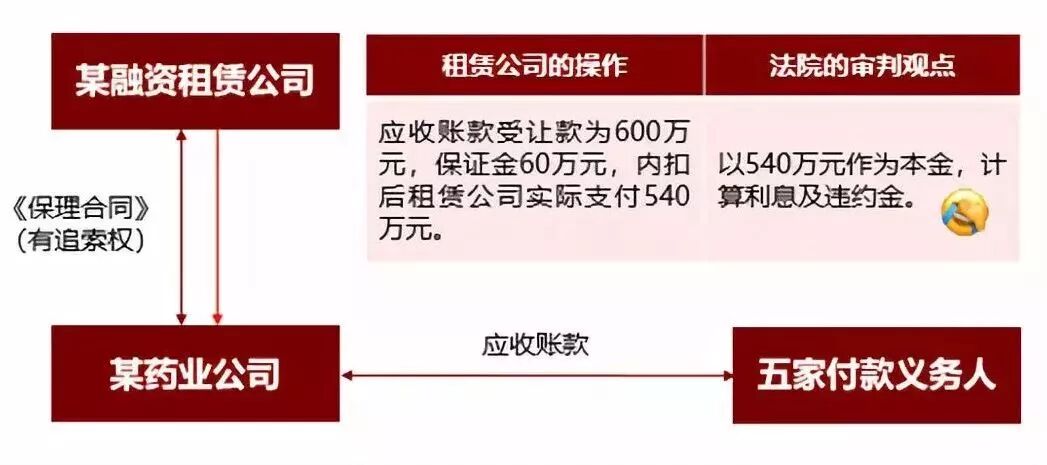 原告某融资租赁公司与某药业有限公司签署《保理合同》(有追索权),约定由某融资租赁公司以6,000,000.00元受让某药业有限公司对其他五家付款义务人享有的应收账款。为减少付款路径,某融资租赁公司在扣除了某药业公司应向某融资租赁公司支付的保证金600,000.00元后,实际向某药业公司支付融资本金5,400,000.00元。