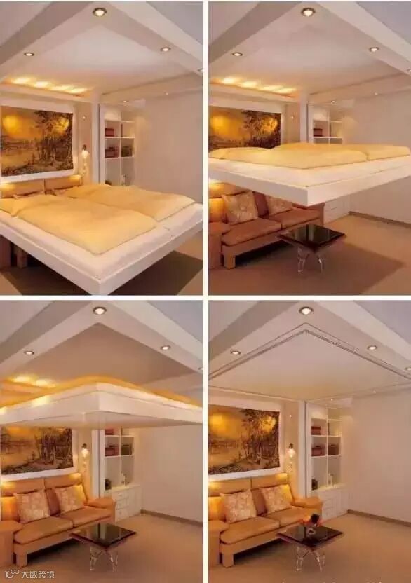 可升降的床,只要在一角留出位置,在需要的时候把床降下来就OK了。