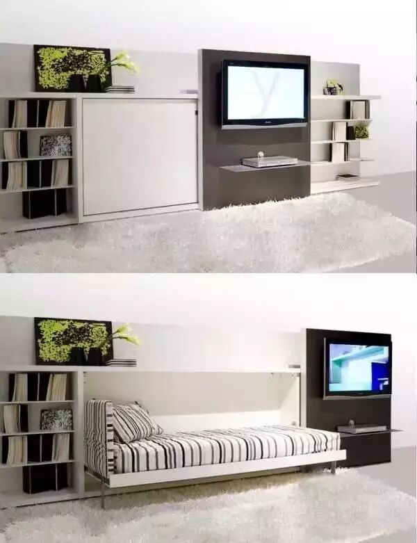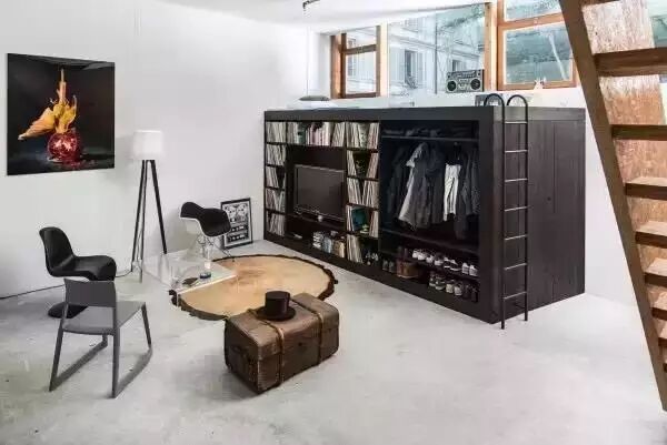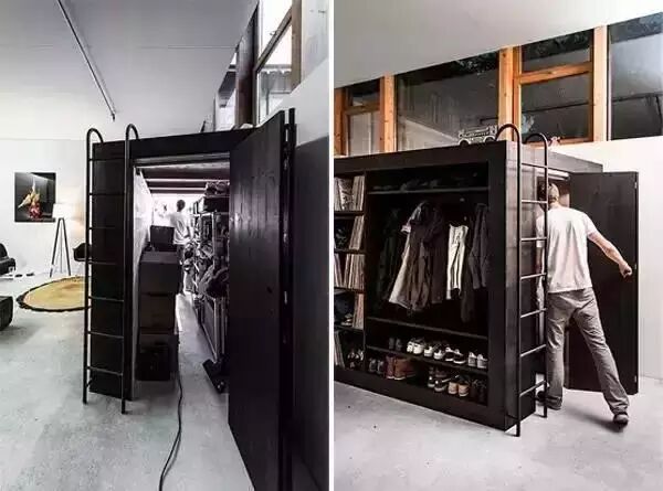 “生活空间电视柜”,光看看这台电视柜上集成的功能就令人惊叹,书柜、衣柜、鞋柜、床……还有,别忘了打开梯子旁边的暗门,进去之后,还有更广阔的空间,里面可以是储藏室、工具间等。