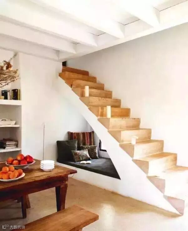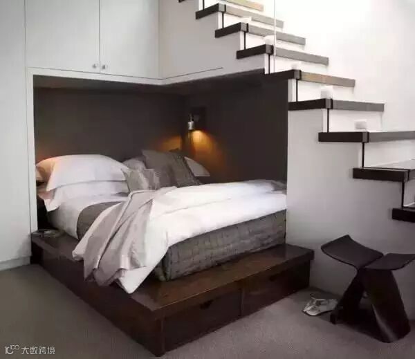 利用楼梯下未使用的区域,像是上面舒适的双人床在定制的前提下可以紧贴楼梯角的墙壁。