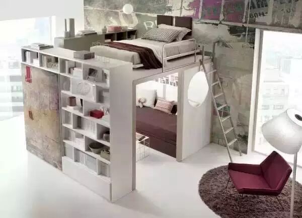 空间节省系统为青少年布置的一间独一无二的卧室,非常灵活的可隐藏式的双层床,使用一张床或者两张床随便你。