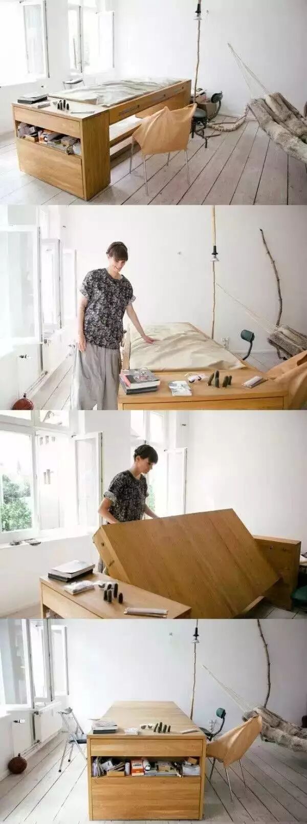 一张很有趣的工作桌,平时是工作桌,但只要解除锁定开关后就可以翻转过来变成一张单人床,并且左右两侧设有置物空间可以来把桌上的东西清空,适合晚上加完班时可以让身体得到适度的休息的一张好桌(床)。