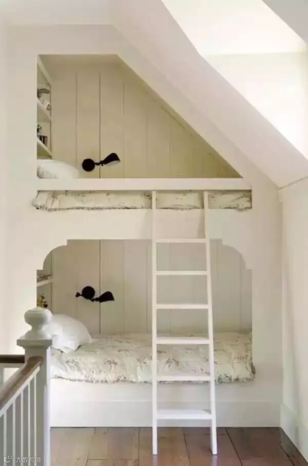 就像在这个倾斜的屋檐阁楼空间里巧妙利用上下铺解决了空间不足问题,床头还采用了储物架放置一些杂物。