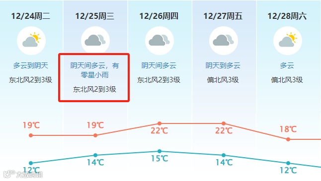 25日受东南气流影响,云量增多,阴天间多云,有零星小雨;