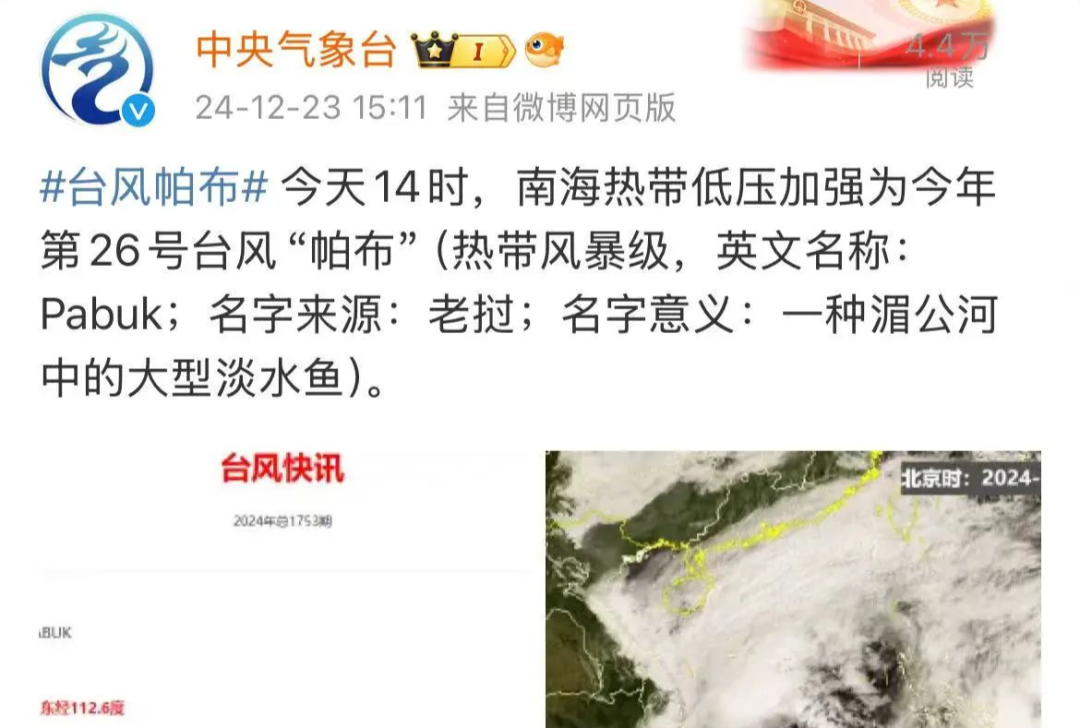 【大风】 12月23日下午至25日,受冷空气和台风“帕布”的共同影响,福建沿海、广东沿海、海南岛沿海、台湾岛沿海、东海南部、台湾以东洋面、台湾海峡、南海大部、巴士海峡、北部湾有6~7级大风,阵风8~9级,南海北部和西南部的部分海域以及西沙群岛附近海域风力有8级,阵风9~10级。