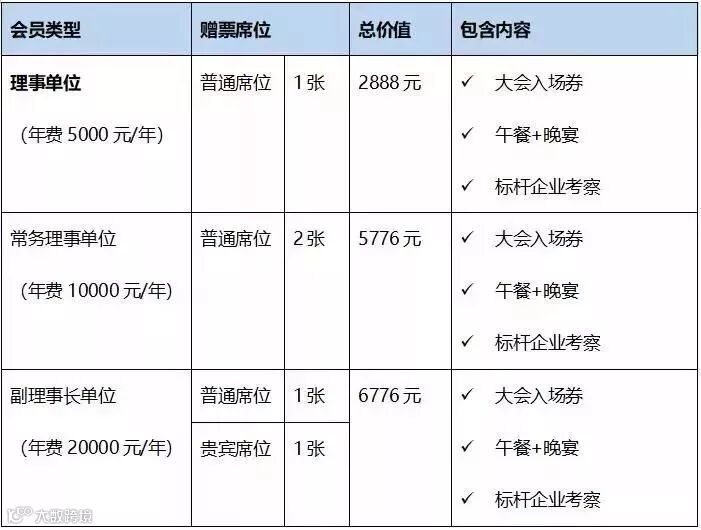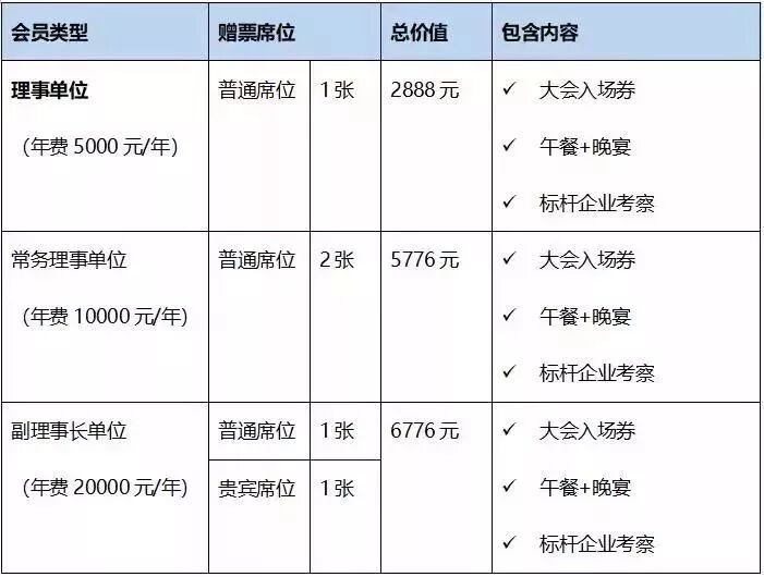 1、理事单位,赠送1张 普通席位(含:大会门票+晚宴+标杆企业考察,总价值2888元);