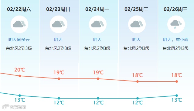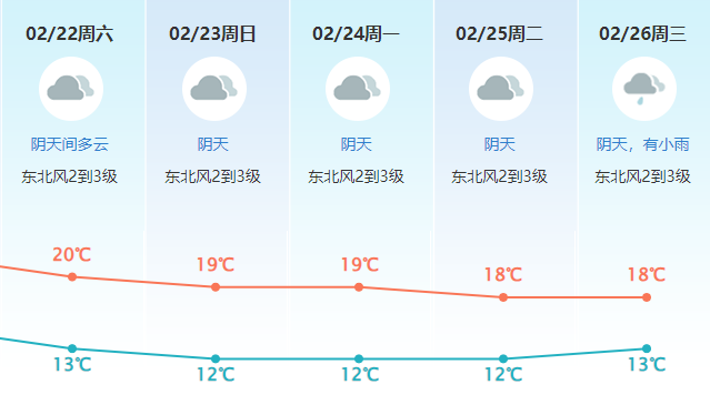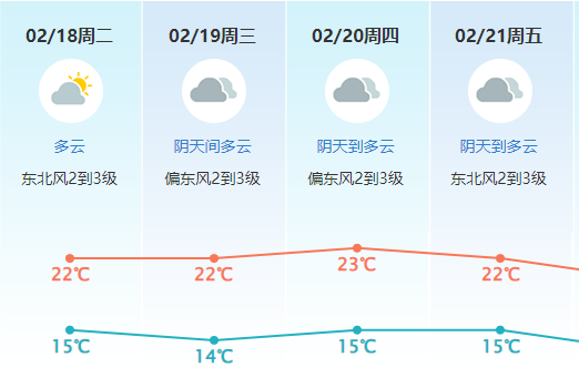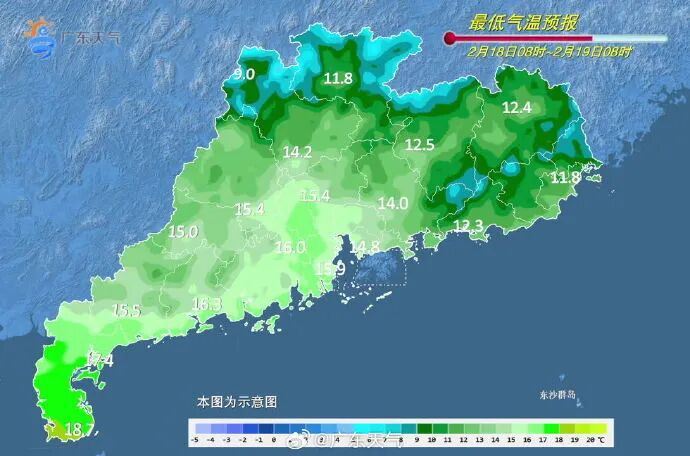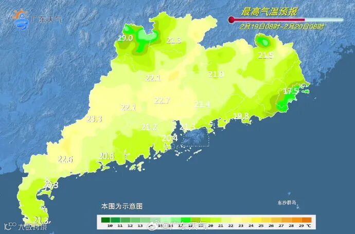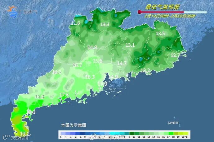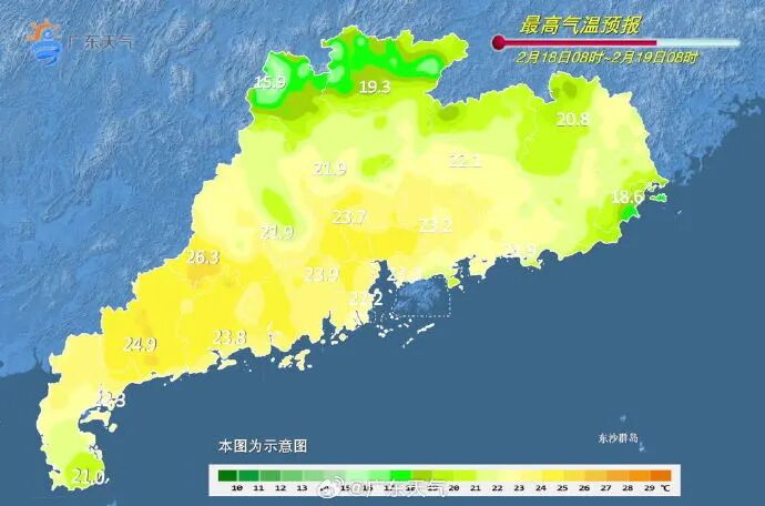 其中,2月18日受弱冷空气补充影响,中北部市县气温小幅下降,2月20日受新一股冷空气前锋影响,粤北偏北市县气温下降1~3℃。