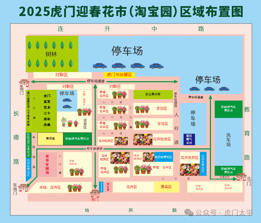 今年虎门淘宝园迎春花市占地面积达5万平方米,将设置近200个摊位,包括鲜花区,年桔区,对联区、盆景艺术展览区、美食区和陶瓷区等。