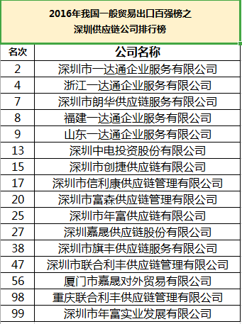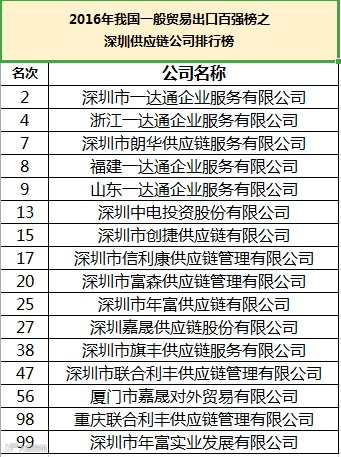 2017年,海关信息网发布的“2016年我国一般贸易出口企业百强榜”中,深圳供应链企业有16家企业上榜。