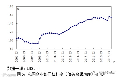 一是在经济下行压力持续较大的背景下,杠杆率高企放大了企业融资难融资贵问题。在经济增长下落时,小微企业相对于大型企业而言,收益率、回款率会更快下降,现金流快速恶化,使得银行信贷更多地投向大中型企业(Gertler and Gilchrist,1993;1994)。这在理论上被称为信贷的“质量逃亡”,即在在经济下滑或者实施紧缩性的政策时,银行信贷从“低净值”的借款者转移到“高净值”的借款者(Bernanke and Gertler,1989)。这是个全球性现象,但由于我国企业特别是中小企业的收益更依赖规模扩张和经济增长,这一现象在我国表现得更加突出,企业的营业收入相对于经济增速的下降速度更大。例如,2011-2015年,我国GDP同比增速从9.5%持续下降到6.9%,而我国工业企业的主营业务收入同比增速从27.23%下降到了0.8%,利润同比增速更是从25.35%下降到了-2.3%,下降幅度均超过了GDP同比增速降幅的10倍。更为重要的是,近年来与我国企业融资难与融资贵问题相伴的是企业部门的杠杆率持续上升,从2012年初的115%上升到了2018年6月的155%(如图5所示)。高企的杠杆率在经济上行阶段会给企业投资经营带来正的杠杆效应,而在经济下行阶段会给企业投资经营带来负的杠杆效应,放大企业的债务负担和融资困境。