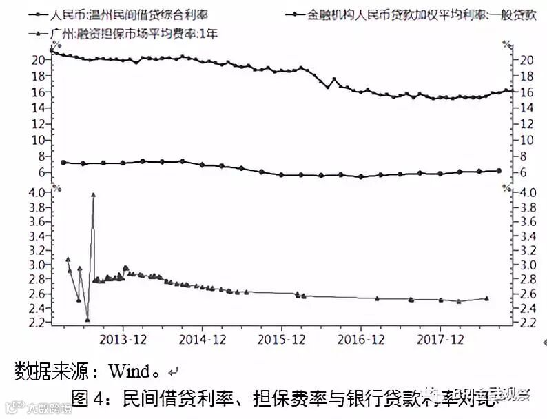五是民间借贷利率和第三方收费高是企业融资贵的重要来源。2014年以来,在货币政策和减费政策的引导下,我国企业从银行贷款的平均利率大幅下降,近两年来维持在6%左右的水平,银行服务收费项目不断规范,收费项目持续减少。但一些企业在借贷过程中引入了担保公司的第三方担保,担保费率大多为1.5%~3%(如2013年以来广州担保市场的平均费率持续保持在2.5%~3%的水平),有些甚至高达5%。除担保费外,一些担保公司还要求企业将贷款额的10%~20%反存在担保公司作为保证金或提供相应的反担保物,变相提高了企业融资成本。一些企业借助民间借贷融资,而民间借贷的综合利率普遍大幅高于银行贷款。如浙江温州民间借贷的综合利率持续保持在16%左右的水平,较银行贷款利率高出了约10个百分点(如图4所示)。此外,近年来P2P网络借贷兴起,虽然有助于在一定程度上缓解小微企业和工体工商户的融资压力,同时随着互联网专项整治的持续推进,P2P平台的贷款不断规范、利率有所下降,但是根据“网贷之家”的统计,截至2018年底,P2P行业约90%的平台综合收益率在8%~16%之间,还有不少平台的综合收益率在16%以上。