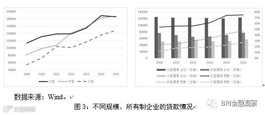 三是不同类型企业的融资难融资贵问题存在差异。这种差异体现在以下几个方面:大中型企业融资仍然容易,而小微企业融资难融资贵问题突出;国有企业融资相对容易,而民营企业特别是民营小微企业融资难融资贵问题突出;坚守主业、不盲目投资的企业融资并不困难,而脱离主业、投资房地产甚至投身民间借贷的企业融资难融资贵。例如,2015年,大型、中型企业的银行贷款余额均超过18.5万亿元,小型企业为14.8万亿元(如图3所示),而小型企业的数量远大于大型、中型企业,小型企业遭受更多、更大的融资难融资贵问题在所难免。与此同时,我国国有企业贷款余额在大型企业贷款余额中的占比超过了70%,而这一比例在中型、小型企业中分别为44.26%和32.57%(朱太辉等,2018)。部分大型、国有企业利用融资渠道便利和资金来源充裕,充当“资金掮客”,对其他企业发放委托贷款和开展资金拆借活动。