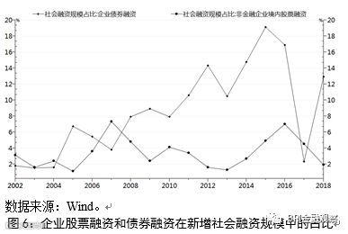 二是金融体系长期由间接融资主导,企业融资存在严重的模式期限错配和风险收益失衡。经济结构转型升级,经济发展从“要素驱动”转向“创新驱动”,更加需要股权融资、债券融资等直接融资模式的支持。但长期以来,中国的融资体系以银行为主,企业发展资金主要来自自我积累和银行信贷,多层次资本市场发展滞后,企业直接融资渠道不充分、不畅通。2002-2016年期间,我国企业股票融资占比始终在1.0%~7.5%之间徘徊,期间的年均占比仅为3.0%,企业融资存在巨大的“模式错配”。与此同时,我国企业的债券融资在新增社会融资规模中的占比虽然整体上处于上升态势,但仍处于20%以下的水平(如图6所示),导致实体经济投融资存在较大的“期限错配”(朱太辉,2018)。此外,政府隐形担保和产品刚性兑付,混淆了风险资产和无风险资产,提高了实际的无风险利率,扭曲了正常的风险收益关系和市场化的资金配置机制,导致企业的整体融资成本“水涨船高”。