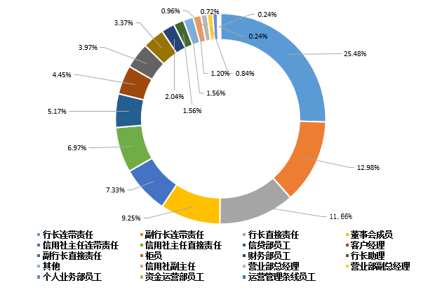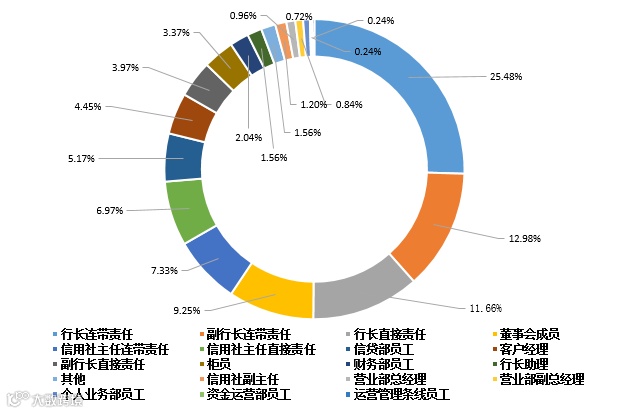 除高管外,信贷部员工及客户经理受到处罚的案件比例较高,分别为5.17%和4.45%,为银行基层员工中案件发生最多的职位。