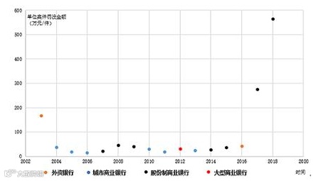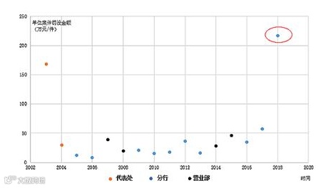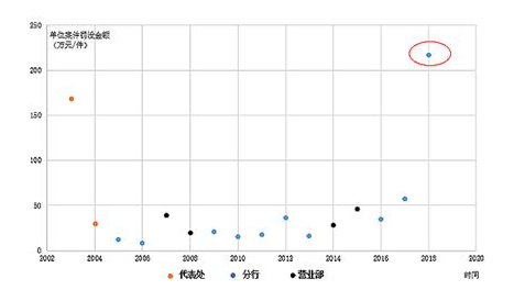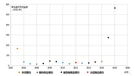 图2 分年度单位案件罚没金额最高银行分支机构(万元/件)