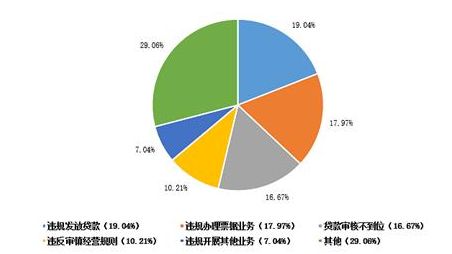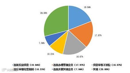 从全部具体的业务类型来看,违规发放贷款占了银行行政案件案由的主要部分,占比19.04%;案由排在第二的是违规办理票据业务,占比17.97%;排在第三的是贷款审核不到位,占比16.67%。