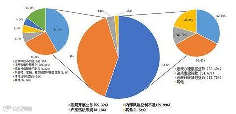 违规开展业务主要是银行未按规定进行已有业务或者开展不被允许的业务,违规发放贷款(34.43%)、违规办理票据业务(32.49%)和违规开展同业业务(6.56%)是银行违规开展的前三大业务;内部风险控制不足主要体现在对内部业务的审核、文件资料、准则等失守或监控不到位,其中,贷款审核不到位(41.7%)、违反审慎经营规则(25.54%)和关联授信管理不到位(6.67%)是内部风险控制不足的前三大因素。