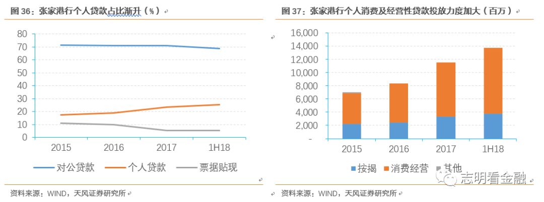 张家港行近年来不良贷款率、关注类贷款率、逾期贷款率的持续下降,除了前述四大因素外(加大核销、改造信贷审批流程、成立特殊资产经营部、贷款集中度管控),与张家港行近年加强零售业务转型、压缩对公不良高发行业贷款也有关系。张家港行近年来逐渐压缩对公贷款和票据贴现,个人贷款投放占总贷款比例由2015年的17.62%上升至1H18的25.52%。与其他银行个贷向按揭贷款倾斜不同,张家港行的个贷主要投向个人消费经营贷款,个人消费经营贷款占总贷款比例由2015年的11.77%提升至1H18的18.56%,彰显坚持小微企业信贷业务不动摇的经营路线。