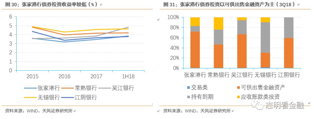 张家港行债券投资中,可供出售金融资产占比高达72.2%,排名农商行第一。可供出售金融资产主要由利率债组成。这对其净息差造成了一定拖累。