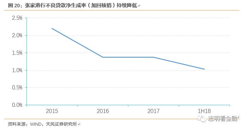 (4)零售业务转型潜力大,资产质量有望持续改善。张家港行零售转型方向以常熟银行为目标,常熟银行1H18个人经营及消费贷款占总贷款比39.86%,张家港行1H18个人经营消费贷占比为18.56%,提升空间较大。随着对公不良高发行业贷款压缩,受经济周期影响较小的零售贷款占比提升,其资产质量有望持续改善。