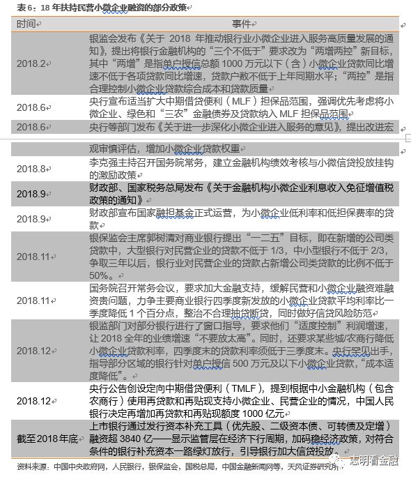 2018年以来,随着中国宏观经济下行压力加大,监管层逆周期对冲调节政策频出,稳经济意图明显。国家对民营小微企业融资的扶持政策密集出台,引导银行对实体(尤其是民营小微企业)经济信贷投放。政策不仅扶持民营小微企业,也让落实政策的银行降低了成本,比如2018年9月财政部、国家税务总局发布《关于金融机构小微企业利息收入免征增值税政策的通知》,对金融机构向小微企业及个体工商户发放小额贷款(不高于1000万元)取得的利息收入,如果其利率水平不高于人民银行同期贷款基准利率150%(含本数),免征增值税。
