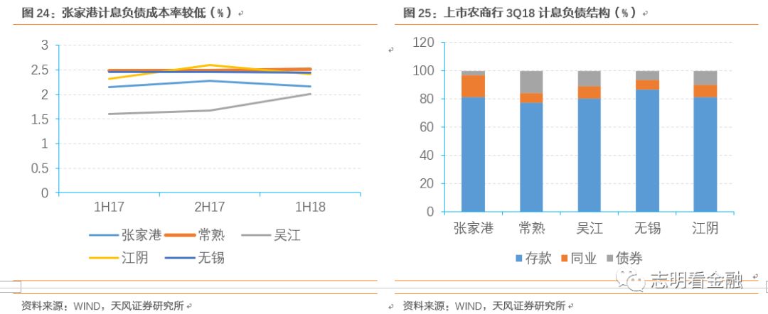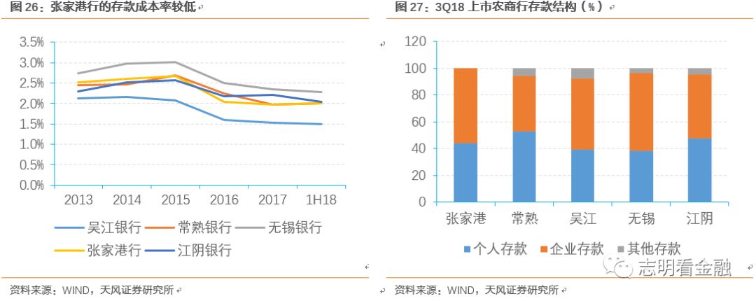 张家港行存款成本率较低。在A股上市农商行里,张家港行存款成本率与常熟银行并列,仅高于吴江银行。其存款结构因为其资产端专注小微企业贷款,因此企业存款占比高,3Q18为55.72%。