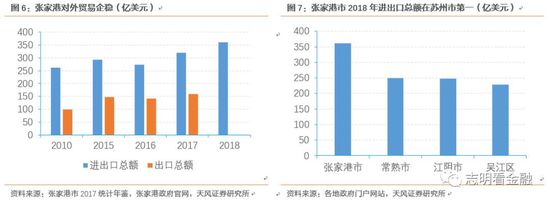 作为港口城市,张家港以外向型经济为主导。张家港市进出口总额经历了2016年小幅回落后,2017企稳回升,2018年进出口总额为361亿美元,位居苏州市行政区第一。