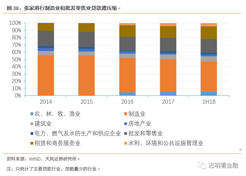 张家港行对公贷款逐步压缩不良高发的制造业贷款和批发零售业贷款。制造业贷款占总贷款比例由2014年的39.1%下降到1H18的27.65%,批发零售贷款占总贷款比例由2014年的14.91%下降至1H18的12.44%,这对资产质量改善形成了良好的传导作用。