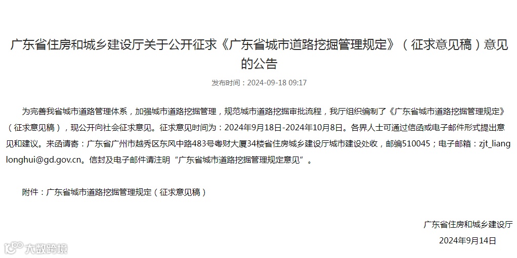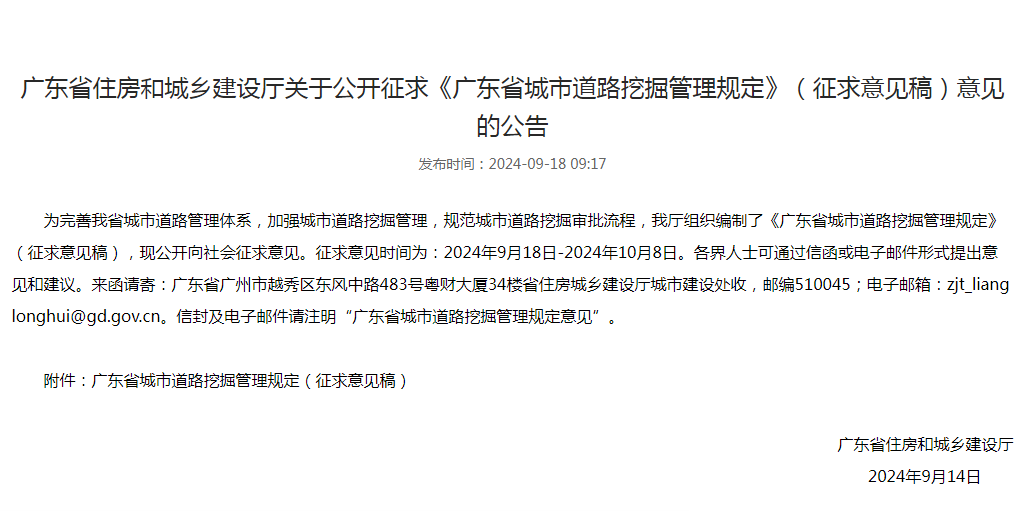 信封及电子邮件请注明“广东省城市道路挖掘管理规定意见”。