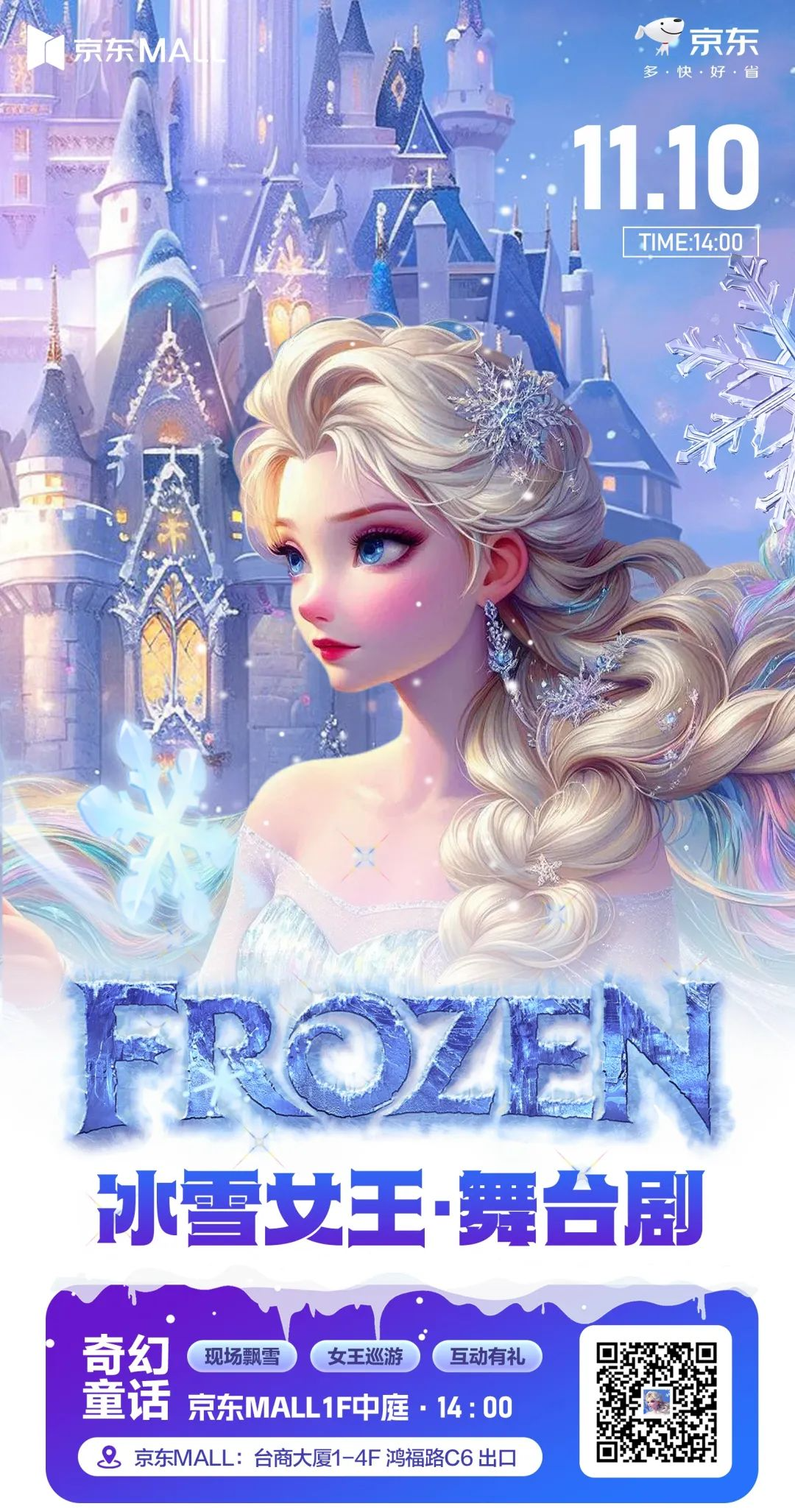 一楼中庭,冰雪女王降临!没有哪个小朋友能拒绝艾莎!快带上你家宝宝来跟艾莎互动合影吧!来东莞京东MALL遇见童话世界,定制冰雪女王舞台剧及巡游更有趣味礼品随机掉落,现在扫码还可以领取充气发箍一个!现场不设门票,完全免费!共两场14:00和16:30,座位有限,先到先得!