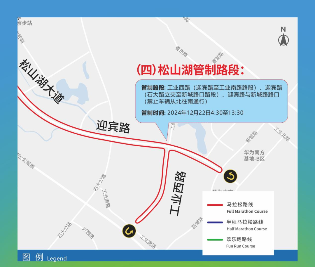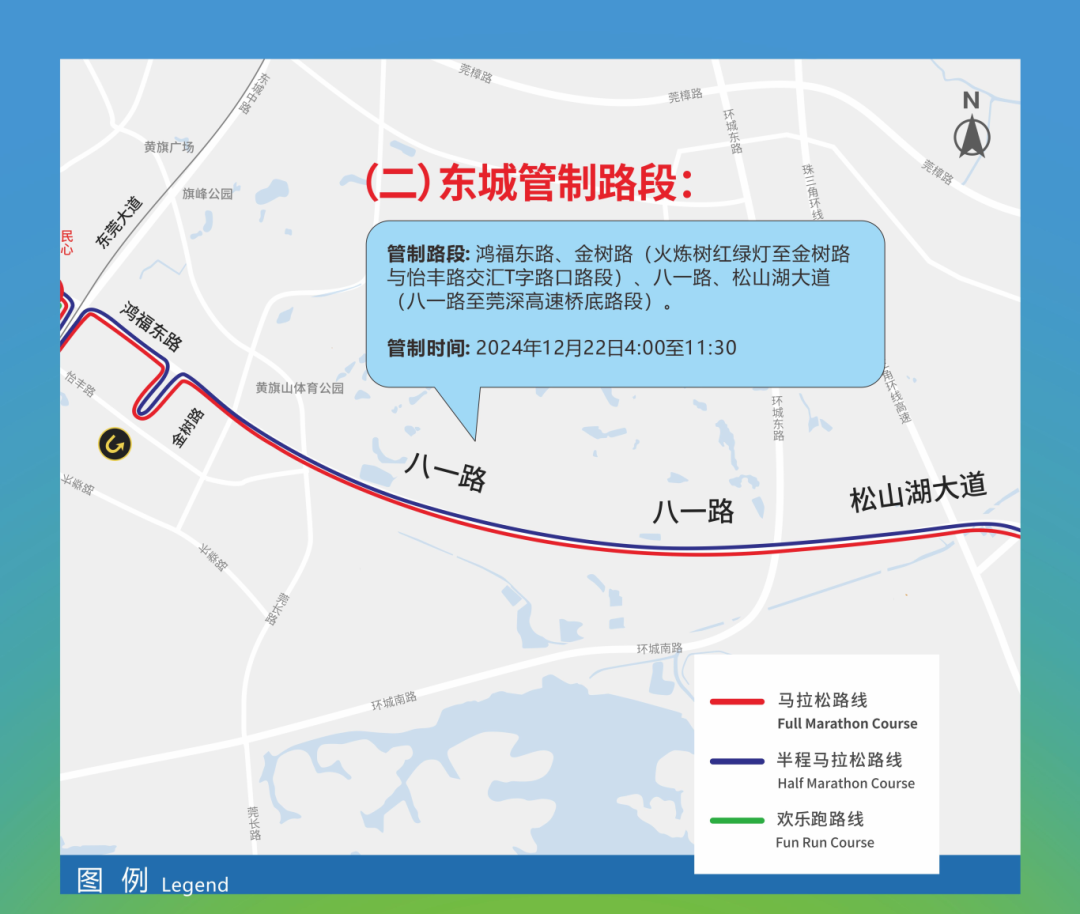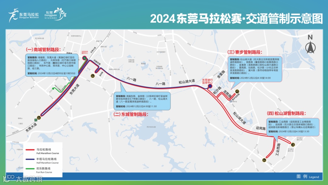 2024东莞马拉松将于2024年12月22日(星期日)7时30分至14时在我市举行。为确保赛事安全顺利进行及比赛期间辖区道路交通安全、有序、畅通,我市交警部门将于比赛当天对辖区南城、东城、寮步、松山湖等镇街(园区)部分道路实施临时交通管制。具体管制路段和时间如下: