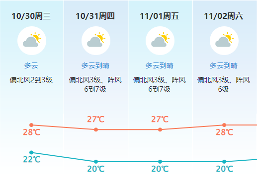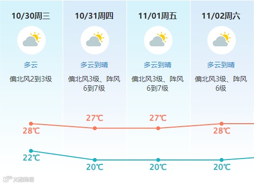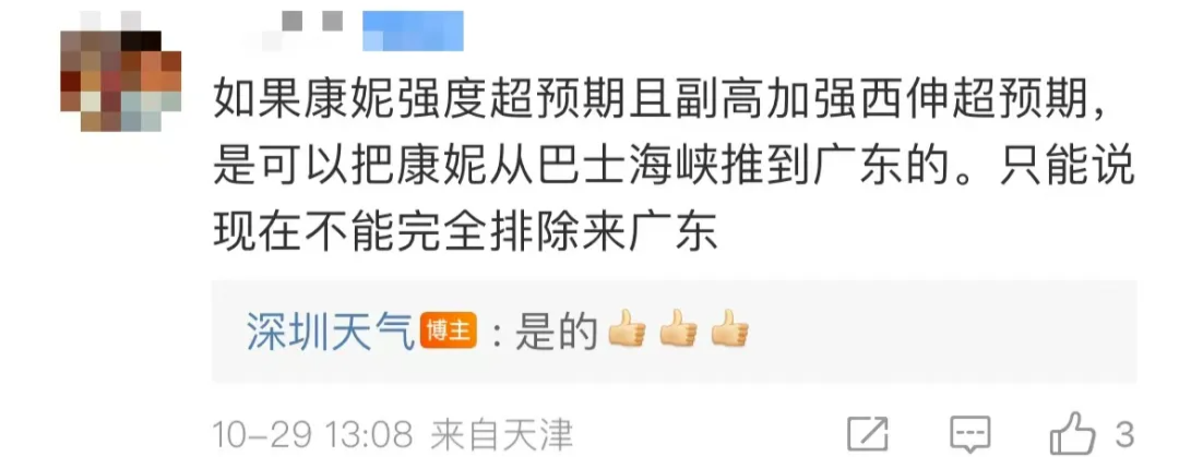 广东省气象部门预计,广东海面10月30日起风力加大,11月1日起粤东市县可能受“康妮”影响出现降水。