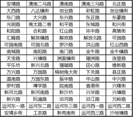 中堂镇新兴路、振兴路、中东路、中麻路、中兴路、南潢路、滨江路、大新围路、凌角街;其他道路参照一般城市道路依法拍摄取证处罚。
