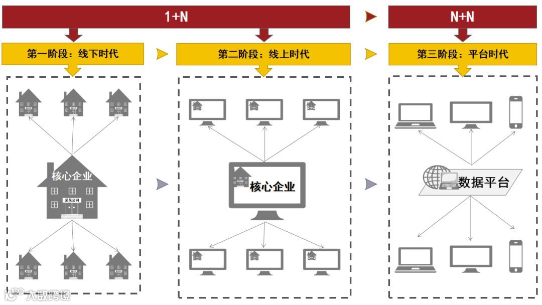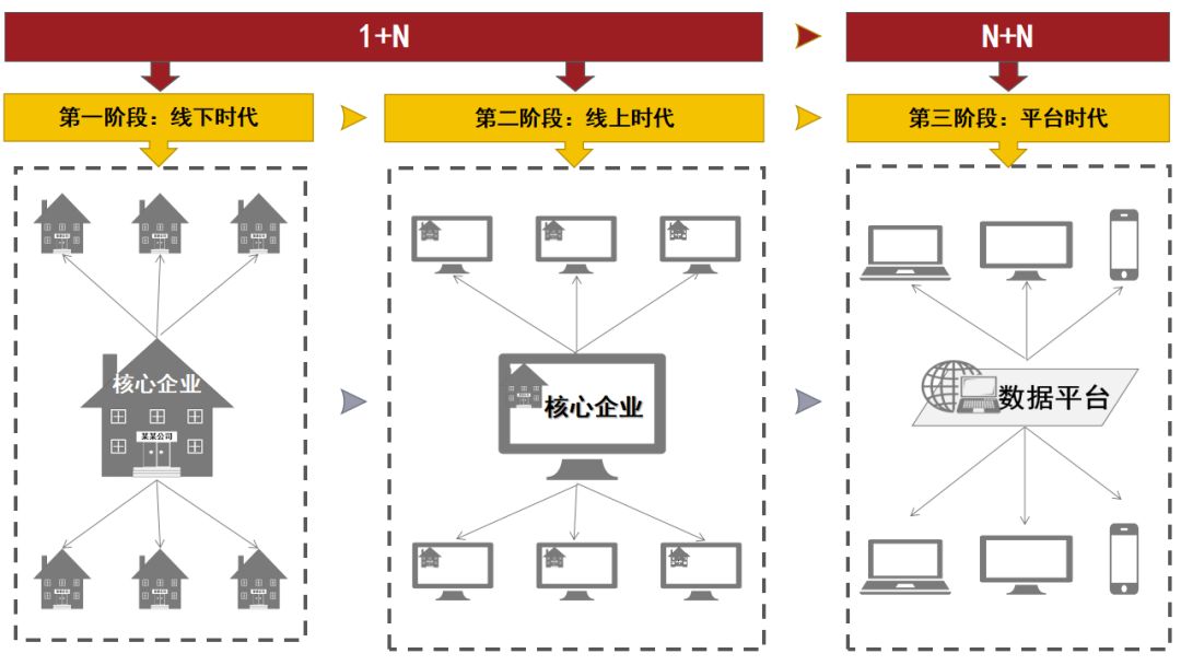 供应链金融大致经历了三个演变阶段,分别为1+N的线下时代,1+N的线上时代和N+N的线上时代。