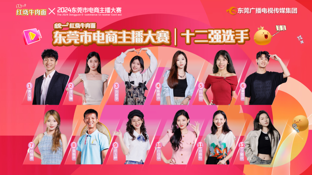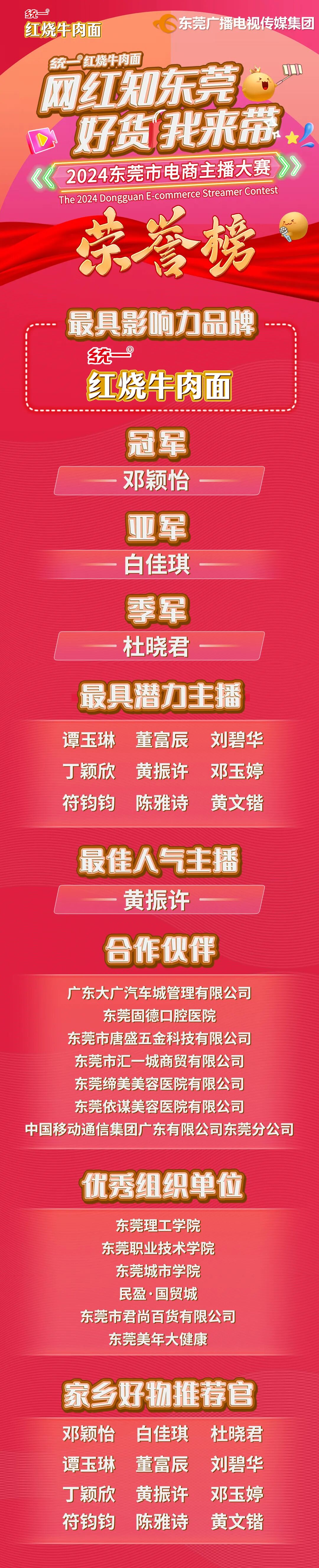 “网红知东莞 好货我来带”2024东莞市电商主播大赛由统一红烧牛肉面冠名,东莞广播电视台主办,东莞广播电视传媒发展有限公司、东莞莞视商贸有限公司、东莞市乡村振兴促进会承办,广东大广汽车城管理有限公司、东莞固德口腔科技集团有限公司、东莞市唐盛五金科技有限公司、东莞市汇一城商贸有限公司、东莞缔美美容医院有限公司、东莞依谋美容医院有限公司以及中国移动通信集团广东有限公司东莞分公司共同协办。