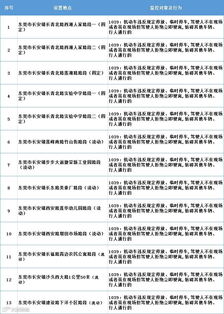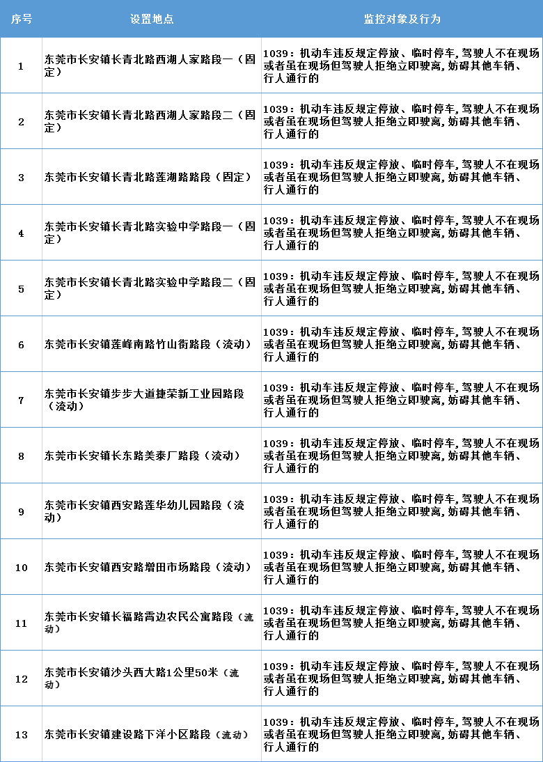 东莞市公安局交通警察支队长安大队在长安镇长青北路西湖人家等路段新增5个违法停车自动记录设备,在长安镇莲峰南路竹山街等路段新增8个移动式交通技术监控设备,请广大驾驶员遵守交通法规,文明驾驶、安全出行。