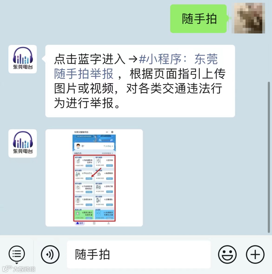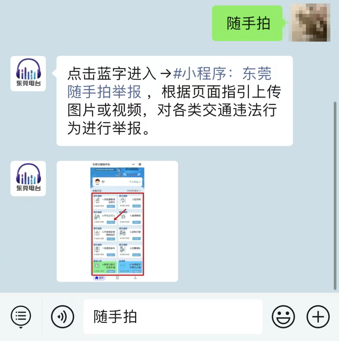 方式1:点击下方卡片关注“东莞电台”微信公众号,点击“发消息”进入对话框,回复“随手拍”,点击蓝字进入小程序。