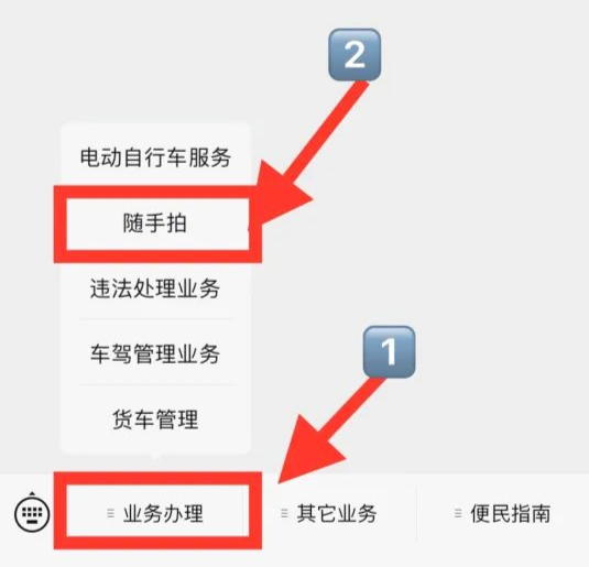 方式2:也可以在“东莞交警”微信公众号,点击下方菜单栏点击“业务办理”-“随手拍”进入小程序。