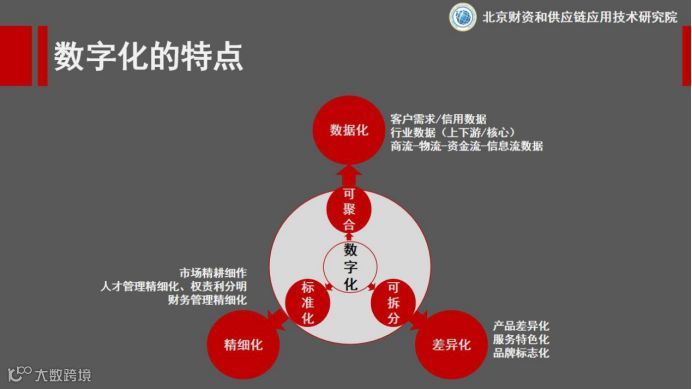 数字化时代有哪些特点?最基础的可拆分,可聚集,最标准化的元素。因为有了可聚集、可拆分,可标准化,才有了数据化、精细化、差异化,有了数据化就可以有客户的需求,信用数据,行业数据,四流数据都可以不断的沉淀下来。有了精细化市场可以不断细分,场景细分,人才和管理都可以精细化运作。有了差异化,不再有同质化产品,我们是差异化的,服务也是各具特色的,品牌也是特色有差异的,只有这样才能数字化的空间里求得生存与发展。