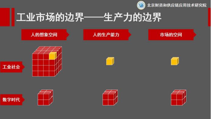 不同的市场有不同的发展方向,同时还有不同的发展潜力。我们看一下市场发展的潜力。工业化需要我们降低成本,提高效率,在我们的生产能力的局限下,我们人类的想像空间,会随着生产力局限到现有资源条件下的市场空间里。到了数字时代就完全不同了,因为我们现在数字化的技术完全可以把线下的物理世界完全呈现到线上,比如说大数据、VR、AR、区块链,这些数字时代的技术完全有能力把我们所有想像得到的东西都放在线上,这就是我们的市场发展潜力是不同的。