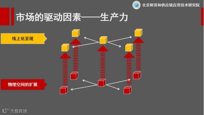 说到市场,它的最重要的驱动力就是生产力,大家都知道从农业社会到工业社会,到数字化升级时代,它每一次推进都是生产力的驱动因素在做背后的推动。每一次推动都有重要的特征,从三个社会来讲,从分散化的市场到工业化市场的集中市场,又进化到数字世界的再次分散的市场,从分散到集中,再到分散,这样的背后逻辑是什么?我们先来看一下农业社会,或者前工业时代,它的分散是由于地域、交通受限,我们只能在比较局限的区域买卖,我们的文化风俗也会受到影响,还有消费者的偏好。还有资源背景的推动,所有这些都是农业社会的分散因素。但是到了数字化时代,完全把所有的东西都放在了我们线上,线上产品极大的丰富了,也刺激了我们的消费者,刺激了终端,产生了个性化产品,个性化产品一旦出来之后,整个市场又再次进入了分散的状态。相对于工业时代的高效率、低成本的机器时代的运作,数字化时代是分散的时代。从分散到集中,到分散,两次分散内部的发展方向有哪些不同呢?我们首先看物理空间的扩展。