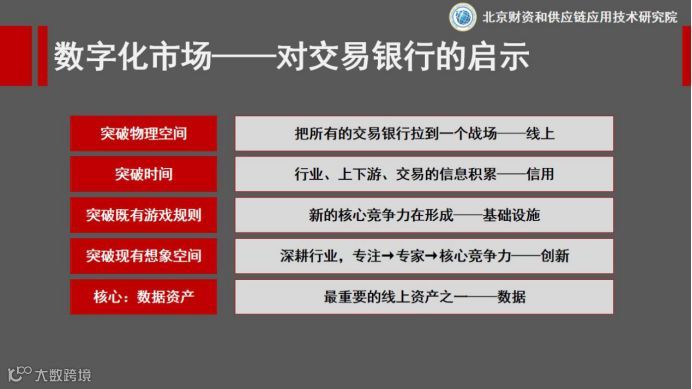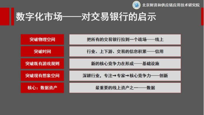 最后,我们在数字化的市场,当下最核心的东西是什么?数据资产将作为一个虚拟资产走上了历史舞台,不管是大公司还是大平台,都需要培育自己的数据核心竞争力。因为没有数据就远远被数字化市场所抛弃。这些是我们在整个的交易银行发展报告编撰过程中的市场逻辑,希望能够对大家有所启发。